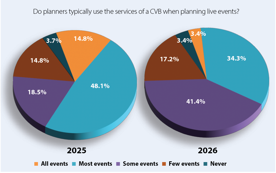 Planners consistently rely on CVBs as a resource for scouting events. In fact, 96.6% reported using CVB services for the live events they produced in 2025.