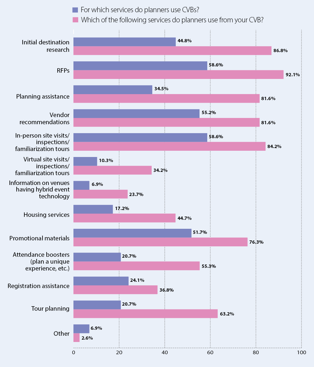 The most commonly used CVB services by planners are RFPs (58.6%), in-person site visits/FAM trips (58.6%), vendor recommendations (55.2%), promotional materials (51.7%), and planning assistance (34.5%).