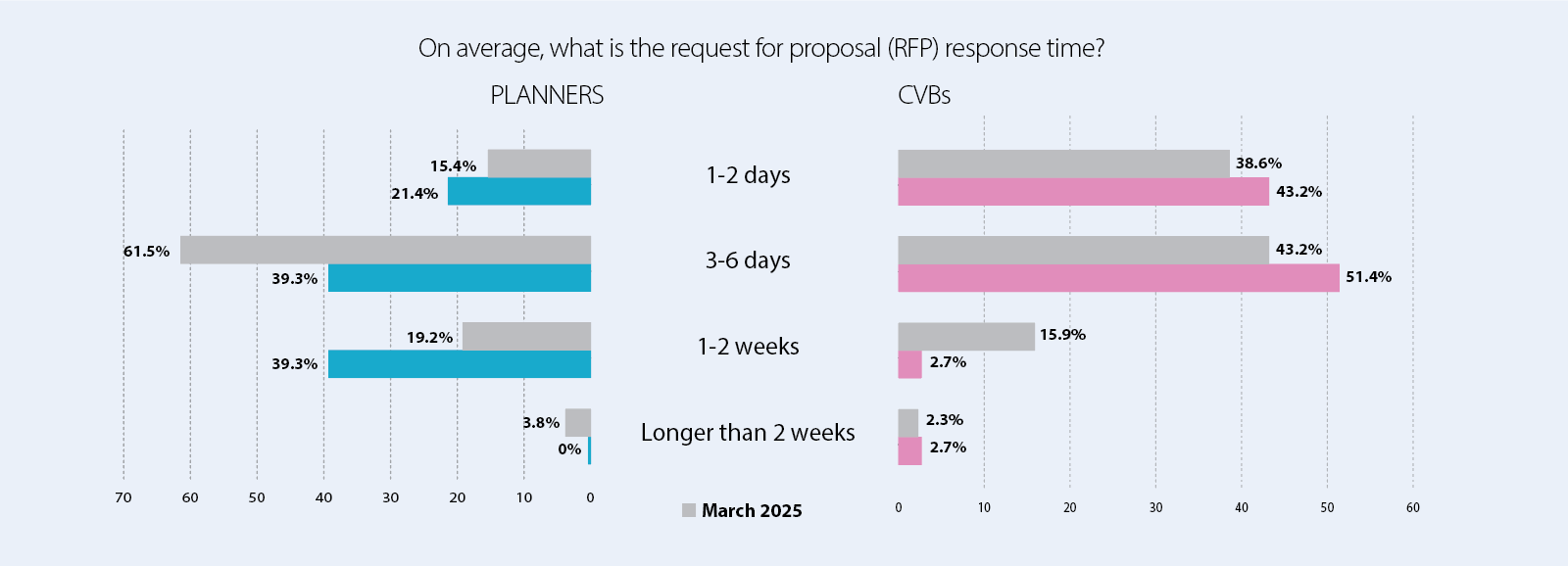 Respondents from the CVB side are also seeking more time to respond to RFPs. While there is still a time crunch, survey results point to easing the burden. According to responding planners, the peak time to receive proposals is tied at 39.3% between three to six days and one to two weeks.