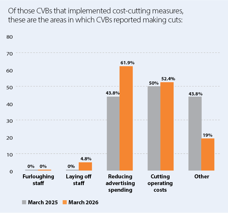 One of the survey’s most encouraging reflections about the industry is only 4.8% of CVBs reported laying off staff due to budget cuts.