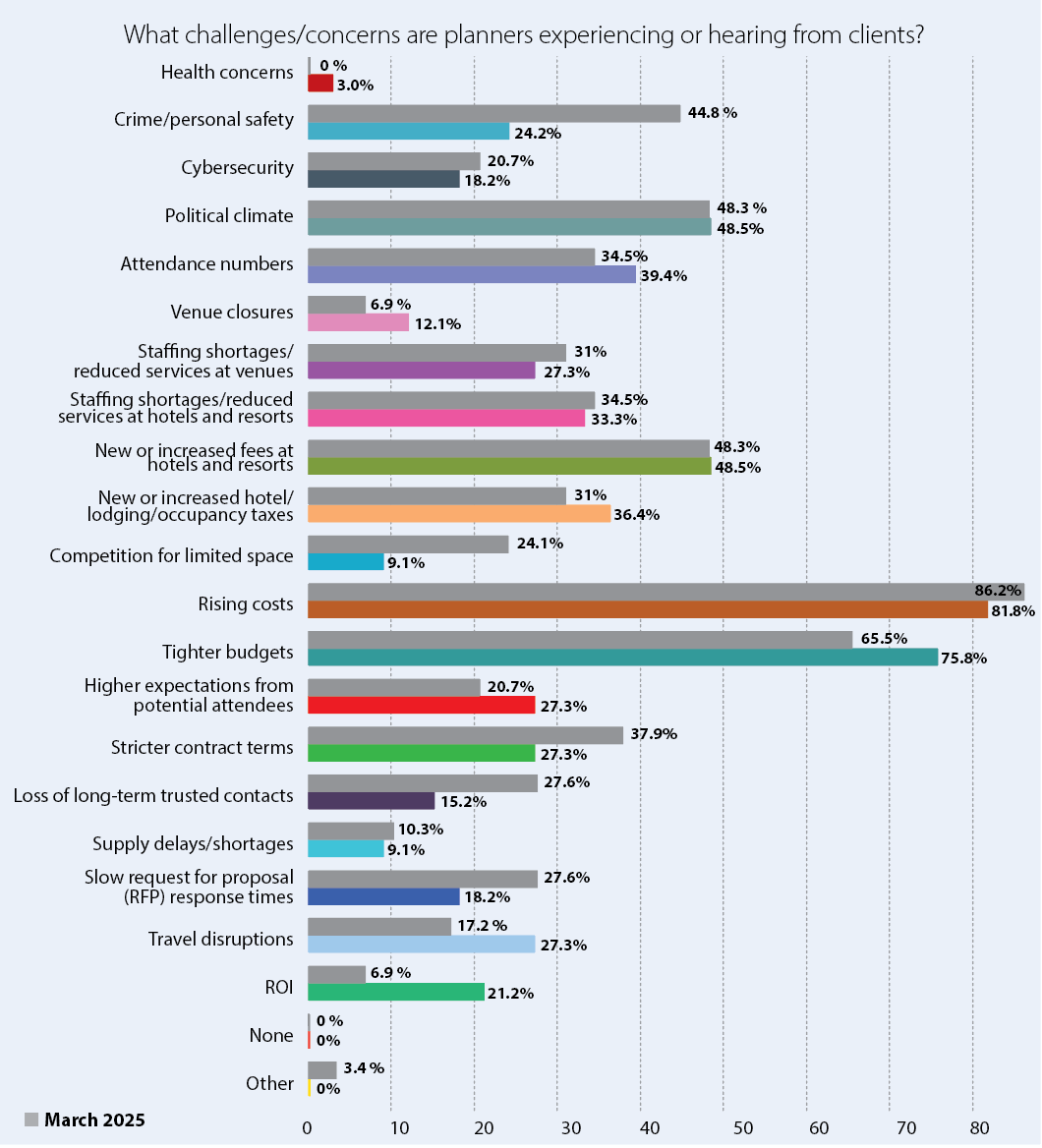 Financial considerations are top of mind in 2026, with planners noting rising costs (81.8%) and tighter budgets (75.8%) among the biggest issues this year.