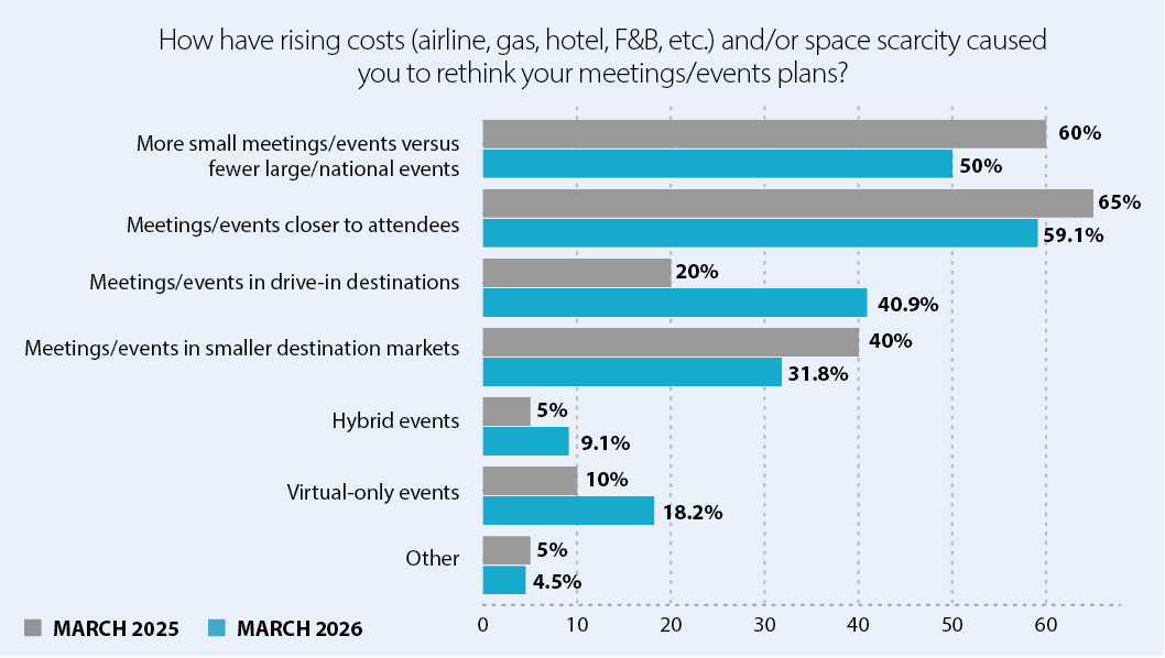 To combat these issues, 59.1% of planners indicated they are moving events closer to attendees, while 40.9% are eyeing drive-in destinations for events. Additionally, 50% of planners are relying on more small events rather than fewer large/national conferences and conventions.