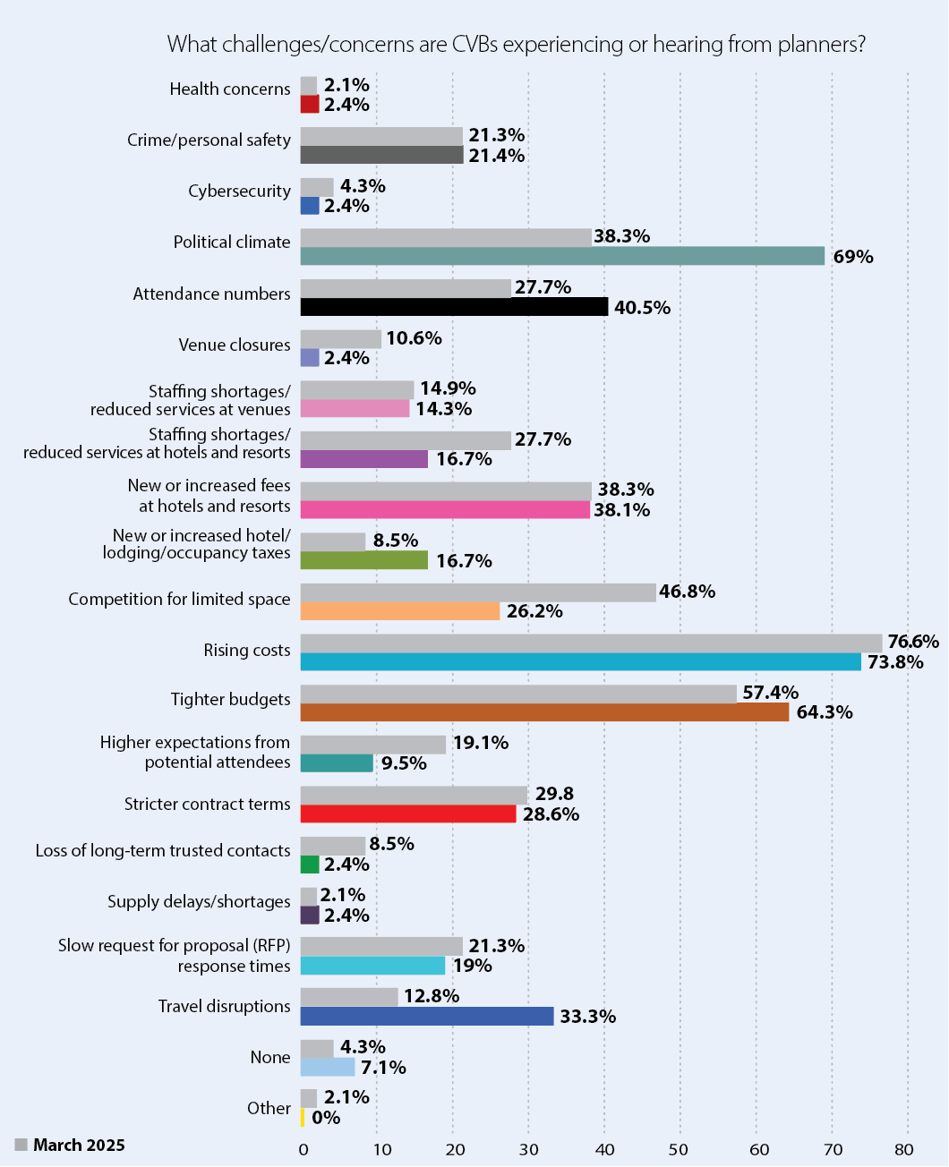 Additional challenges noted by CVBs include rising costs (81%), tighter budgets (64.3%), competition for available space (40.5%), and increased demand for leisure travel (21.4%). However, according to 83.3% of CVBs, these challenges have not negatively impacted their relationships with planners.